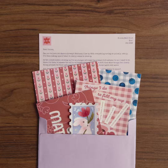 Each month, you’ll receive a thoughtfully curated letter filled with guided prompts, a reflective activity, and art pieces — including two patterned journaling sticker sheets and one exclusive die-cut sticker. Every detail is designed to make writing feel playful, meaningful, and gently inspiring — a soft reminder to slow down, breathe, and come home to yourself on the page.